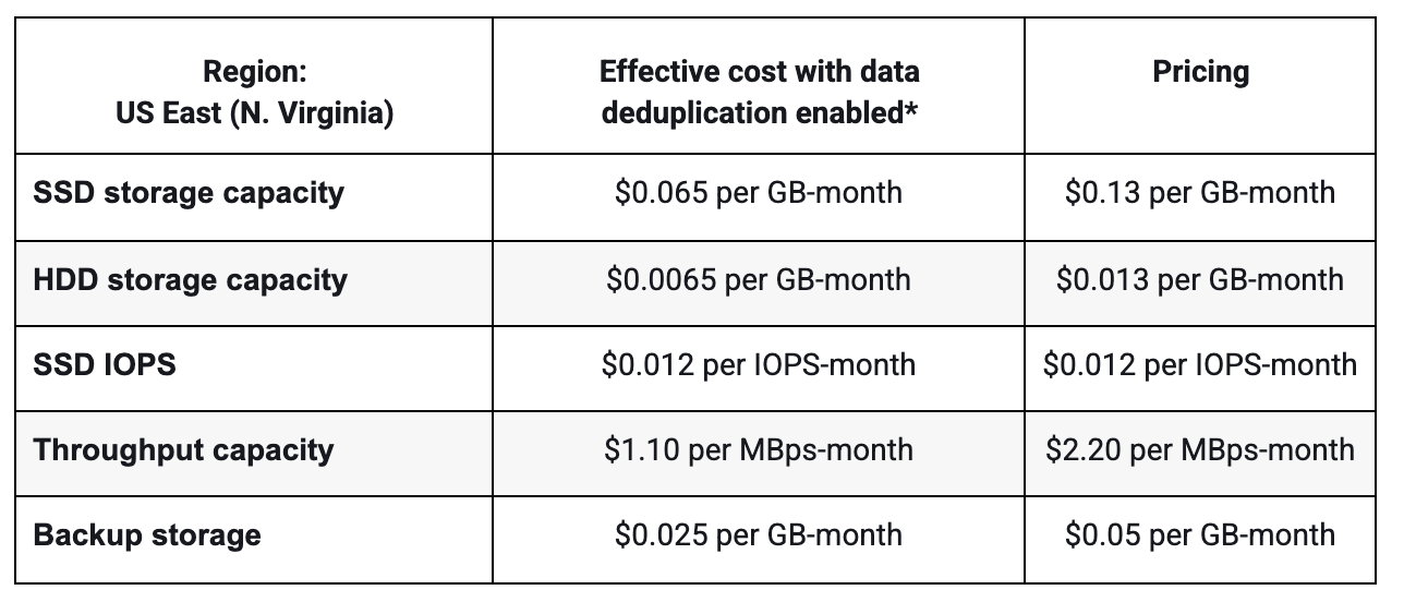 Storage capacity - pricing depends on your choice of SSD or HDD storage, and whether you deploy your file system in a single availability zone (single AZ) or in multiple zones (multi AZ). Cost is calculated according to the average amount of storage, which is provisioned for the file systems on a monthly basis. It is measured in GB-month.